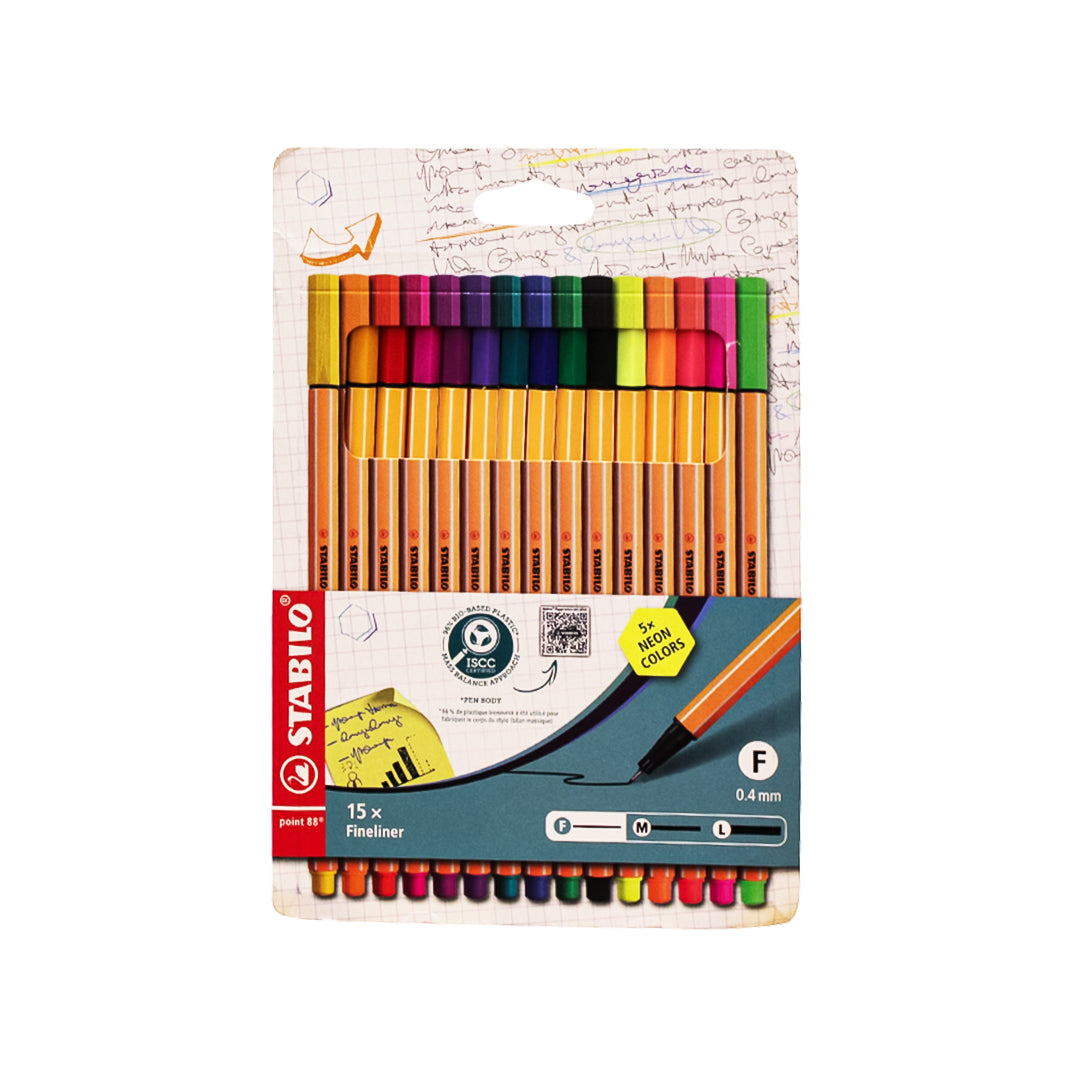 قلم تحديد دقيق من ستابيلو بوينت 88 - 15 لونًا (10 ألوان قياسية + 5 ألوان نيون)