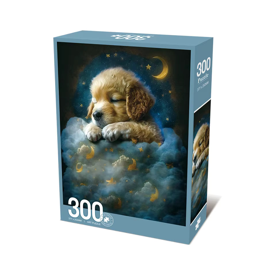 Snuggle up with this enchanting 300-piece puzzle featuring an "Adorable Baby Puppy" drifting off to sleep on a bed of soft, moonlit clouds. Set against a magical night sky filled with golden stars and a glowing crescent moon, this artwork captures the ultimate moment of peace. With its premium "Silky Touch" finish, it's a soothing and high-quality building experience for animal lovers of all ages.