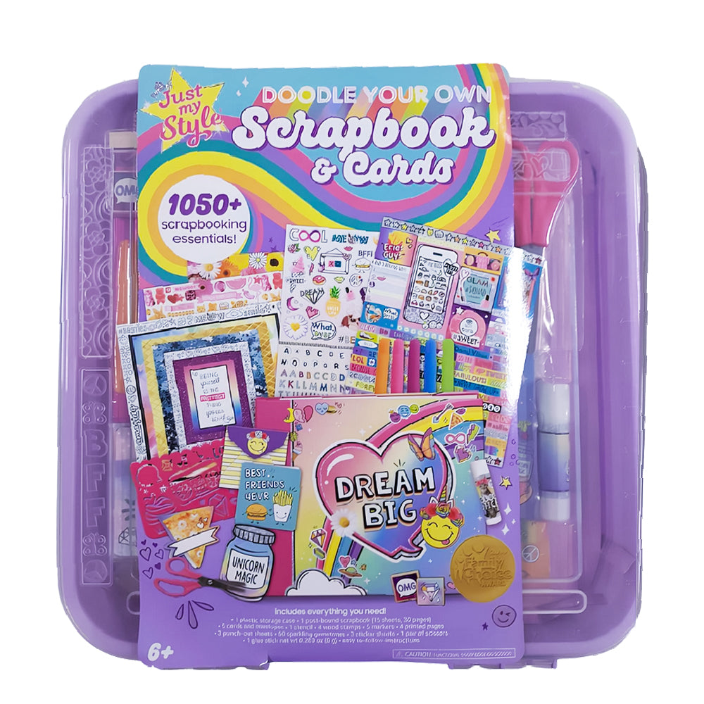 This scrapbooking kit allows users to personalize and display their cherished memories using over 1,050 included scrapbooking essentials. The official name for the product shown in the image is typically the "Just My Style Doodle Your Own Scrapbook & Cards" set.