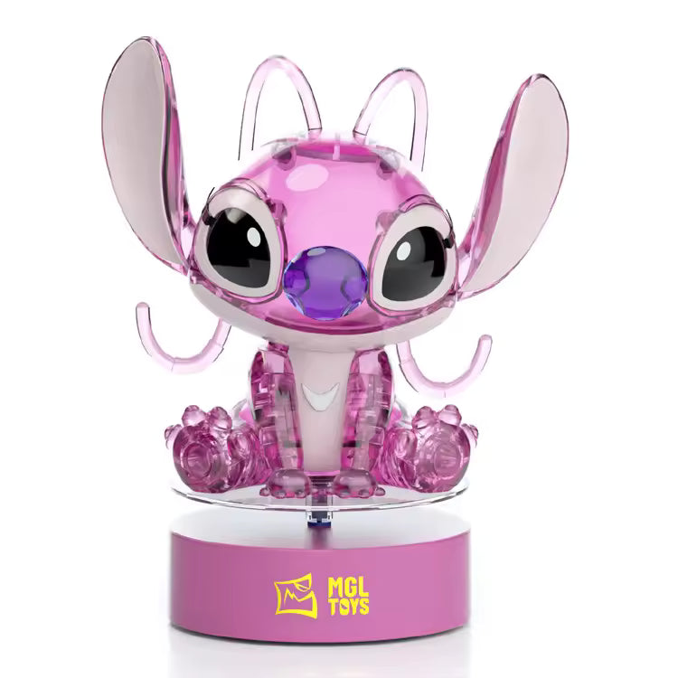 Design and Appearance: The figures have a charming, stylized design. Stitch is rendered in his iconic blue color, while Angel is a vibrant pink. Both figures have large, expressive black eyes and are made of clear, multi-faceted pieces that give them a "crystal" or "diamond block" appearance. Stitch is holding a translucent pink heart, suggesting a theme of love and friendship.